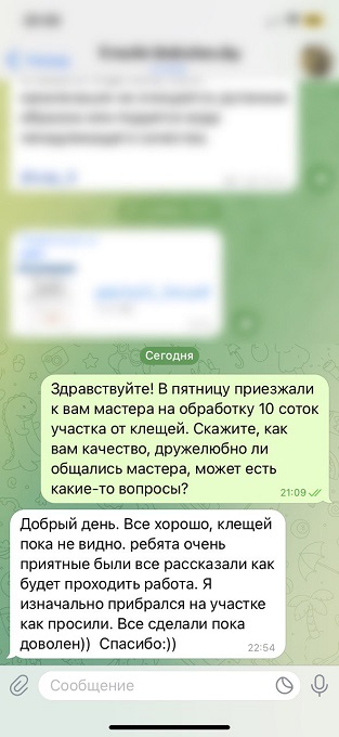 На следующий день, специалист контроля качества сделает звонок с целью убедиться в качестве проведенной обработки. В случае, если по истечению 14 дней проблема не решена мы делаем повторную вторую и третью обработку до полного исчезновения насекомых.